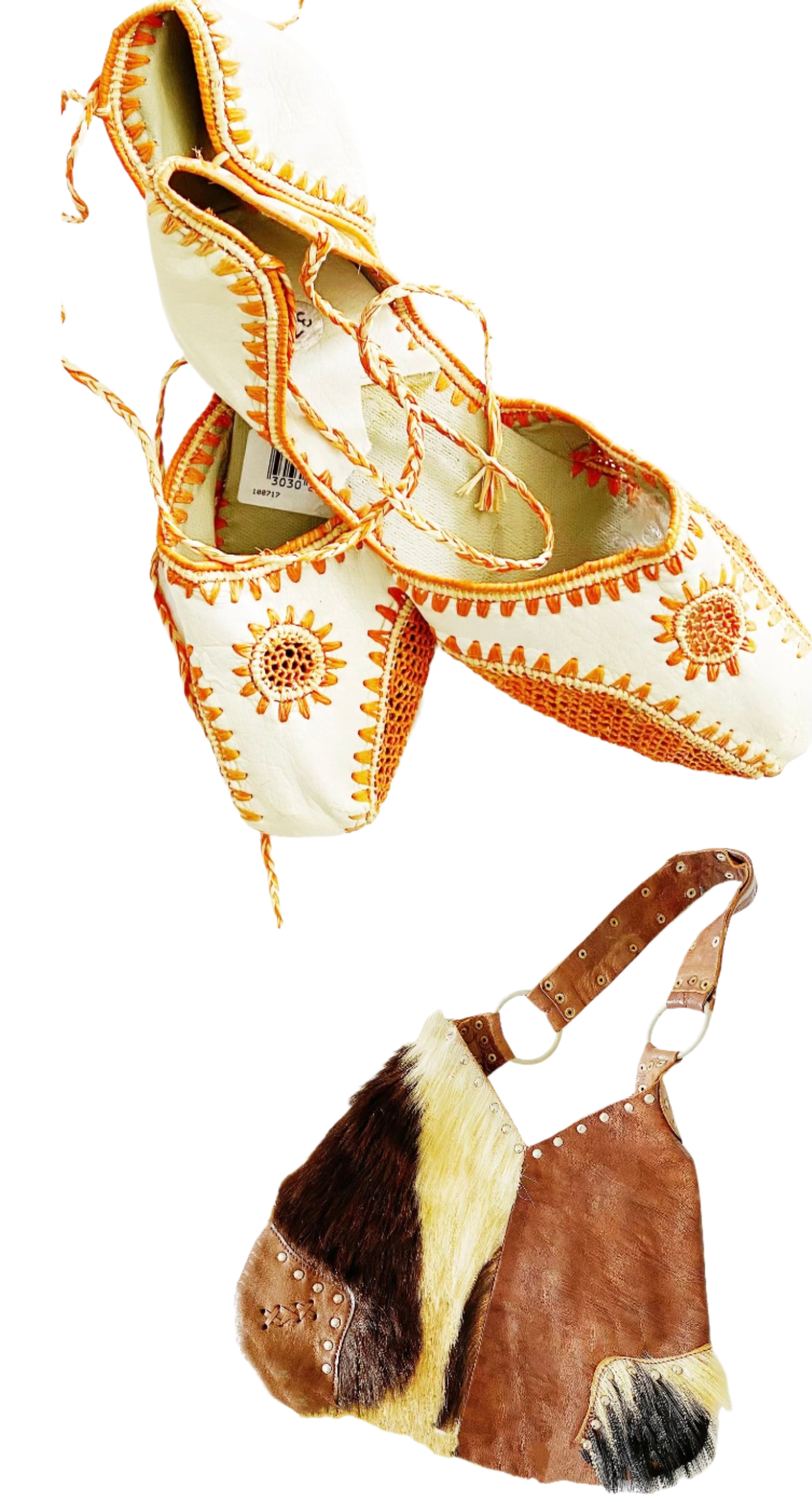 This pair of orange leather slippers adorned with sequins is easy to wear, comfy and nice looking. (Size US 7)  Also check our selection of unique natural leather bags to go with this pair of marvelous slippers.
